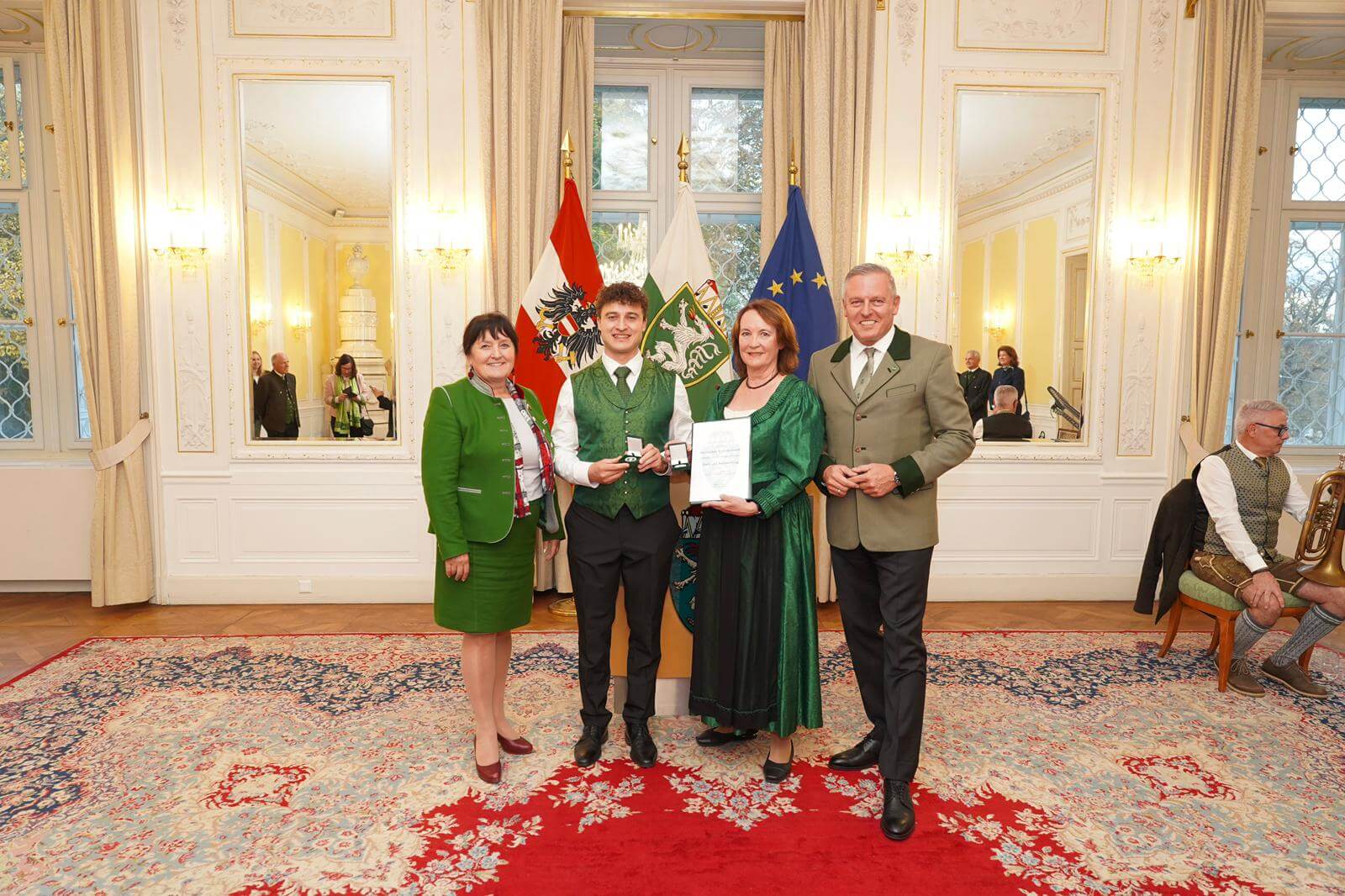 Nach den Festreden überreichte Landeshauptmann Kunasek den Vertreter:innen des Volksliedwerks eine offizielle Dank- und Anerkennungsurkunde sowie Ehren-Coins. Für die musikalische Gestaltung sorgte ein Ensemble des Steirischen Volksliedwerks, das mit ausgewählten Liedern und Instrumentalstücken den Festakt umrahmte.