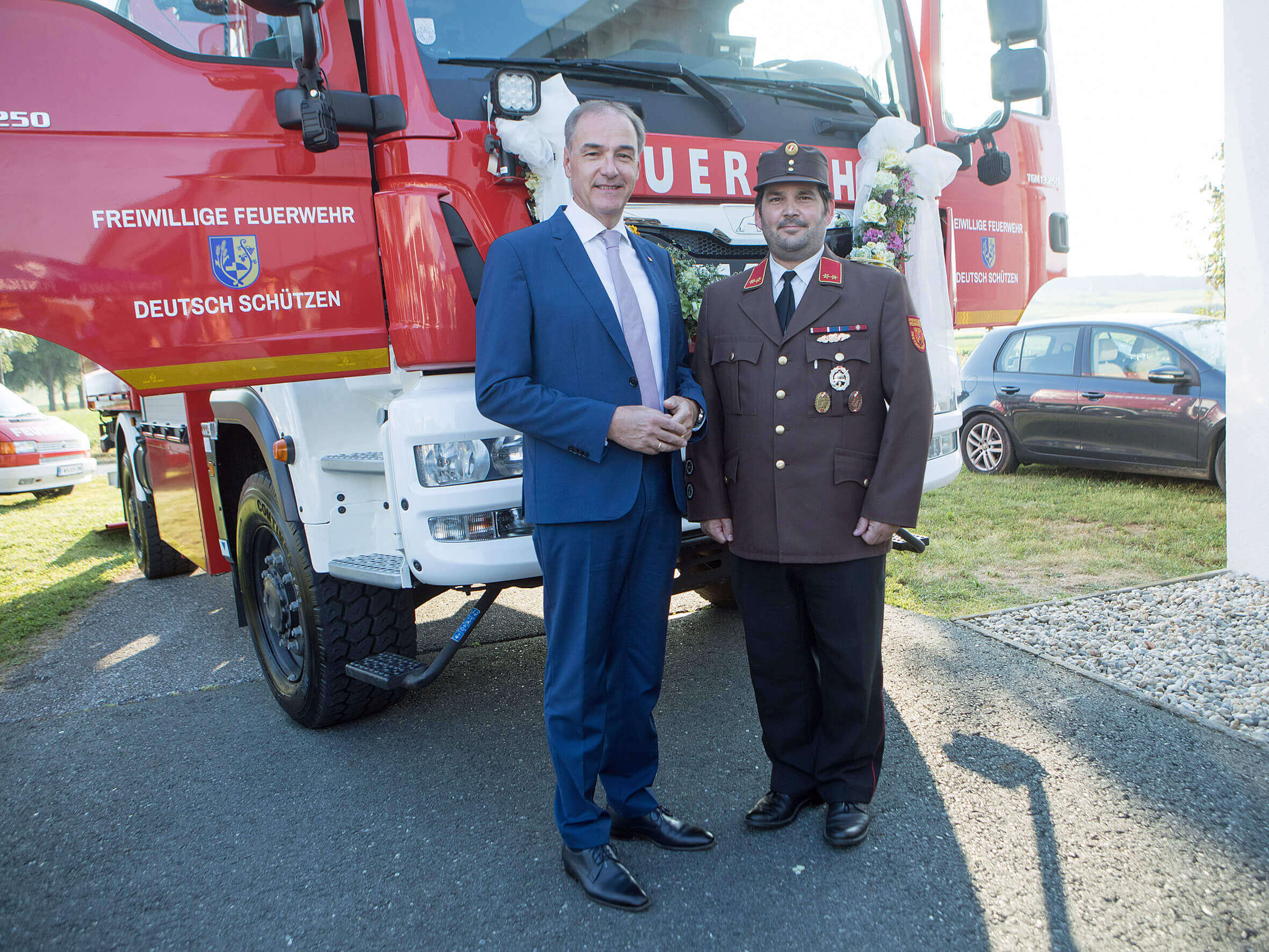 Landesrat Dr. Leonhard Schneemann mit Feuerwehrkommandant OBI Daniel Weber (v.l.) vor dem neuen Löschfahrzeug Allradantrieb – Logistik (LFA-L) der Freiwilligen Feuerwehr Deutsch Schützen.