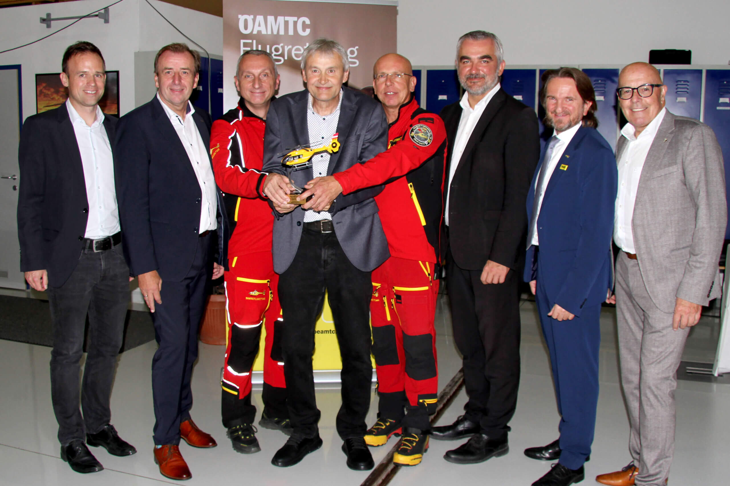 Landesrat Heinrich Dorner mit Marco Trefanitz, Geschäftsführer der ÖAMTC-Flugrettung, LAbg. Christian Drobits, Oberwarts Bürgermeister Georg Rosner und Stadtrat Marc Seper mit C16-Stützpunktleiter Andreas Tautter, dem Leitenden Notarzt Wilhelm Urschl und dem Leiter des Rettungsdienstes des Roten Kreuzes Burgenland, Hans-Peter Polzer, der sich vor Kurzem aus dem aktiven Dienst am C16 verabschiedete.