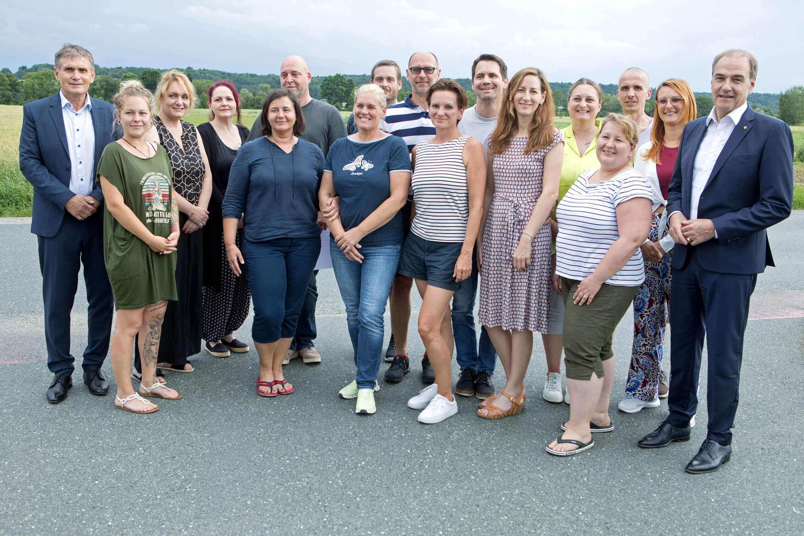 Landesrat Dr. Leonhard Schneemann (rechts) und HS-Prof. Mag. Dr. Klaus Novak (Leiter des Instituts für Fortbildung und Beratung der Privaten Pädagogischen Hochschule Burgenland) (links) mit den neuen zertifizierten Pflege- und Adoptiveltern in Oberwart.