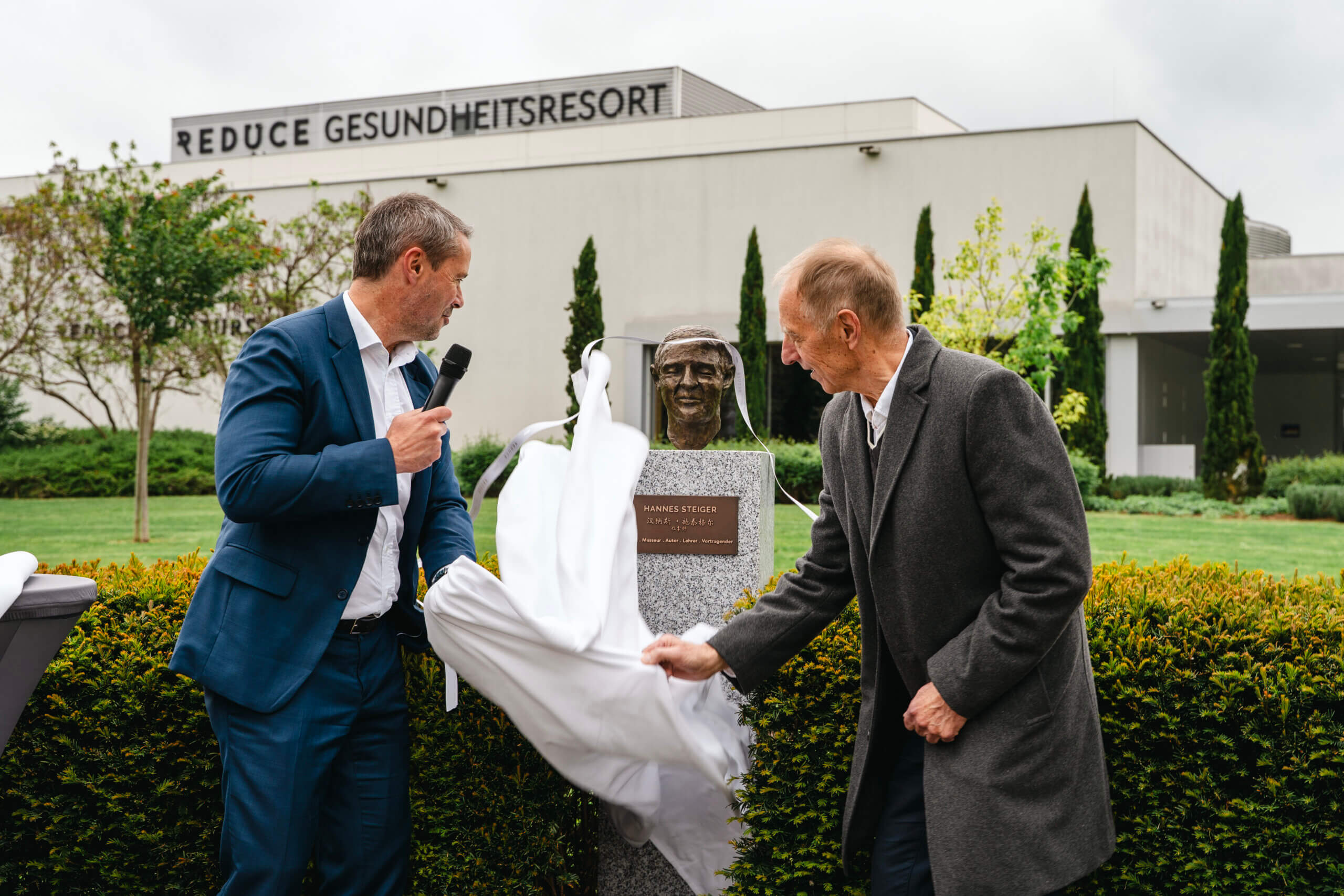 Der Heilmasseur Hannes Steiger erhielt im Kurpark von Bad Tatzmannsdorf eine Büste. Damit würdigen Wegbegleiter:innen, Ehrengäste und die Geschäftsführung des REDUCE Gesundheitsresorts seine jahrzehntelange Arbeit in der Akupressur und seine Rolle als Buchautor. Die Enthüllung fand am 8. Mai 2025 im Rahmen eines Festakts statt.