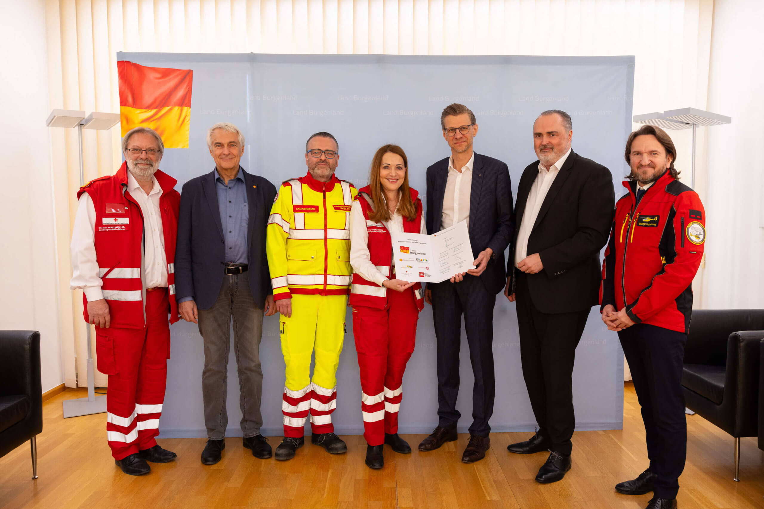 Das Land Burgenland implementiert mit 1. Oktober 2025 gemeinsam mit dem Roten Kreuz Burgenland, dem Samariterbund Burgenland und der ÖAMTC Flugrettung ein einheitliches Qualitätsmanagementsystem (Archivfoto von der Unterzeichnung der Vereinbarung für eine noch geordnetere Patientenübergabe): (v.l.) Thomas Wallner, MSc, Landesgeschäftsführer des Roten Kreuzes Burgenland, Univ.-Prof. Dr. Stefan Kriwanek, ärztlicher Leiter der Gesundheit Burgenland, Samariterbund-Burgenland-Geschäftsführer Mag. Gerald Fitz, Mag.a Tanja König, Landesgeschäftsführerin des Roten Kreuzes Burgenland, Robert Maurer, MSc MBA, Geschäftsführer der Barmherzigen Brüder Eisenstadt GmbH, Landeshauptmann Mag. Hans Peter Doskozil und Marco Trefanitz, Geschäftsführer der ÖAMTC-Flugrettung