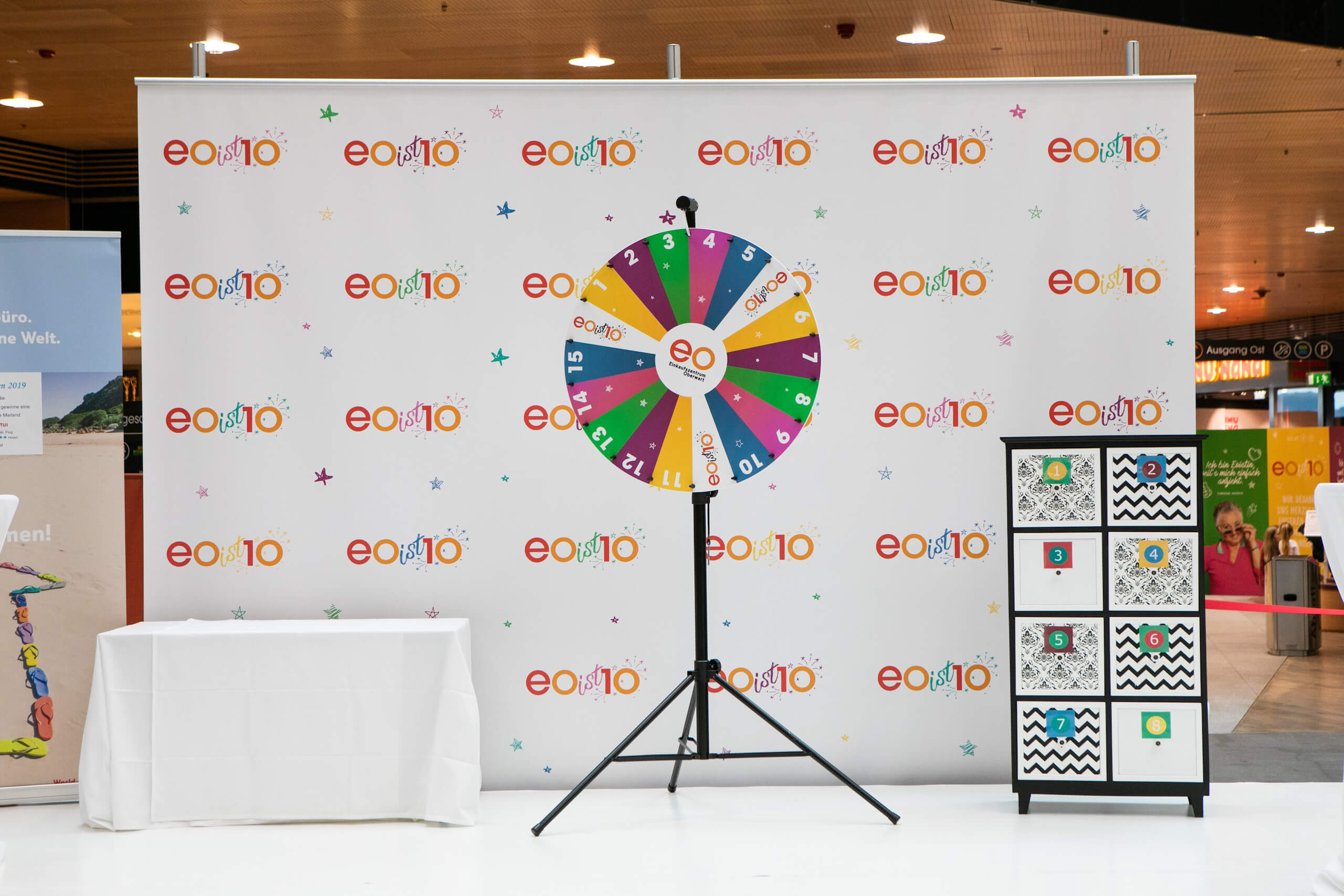 An beiden Tagen gibt es beim Glücksrad und beim Ladenspiel die Möglichkeit, hochwertige Preise (Fernseher, Elektrogeräte, Gutscheine) und Goodies von vielen eo Shops sowie zahlreiche eo Goodies wie T-Shirts, Taschen, Wasserbälle, Magnetnotizblöcke uvm. zu gewinnen. Außerdem gibt es zu jeder vollen Stunde eine eo Gutscheindusche, bei der Sie eo Gutscheine im Wert von 2.000€ pro Runde sammeln können!