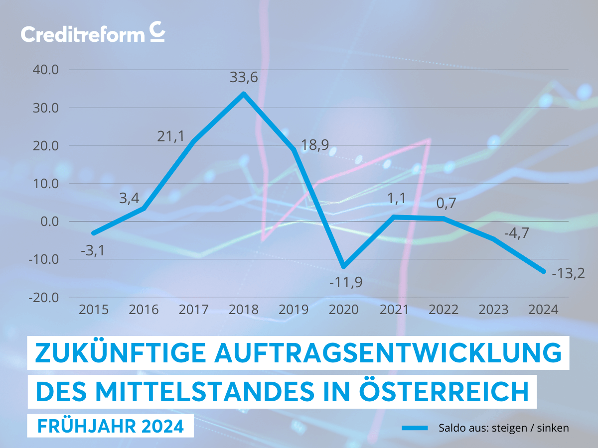 Das Liniendiagramm von Creditreform zeigt die zukünftige Auftragsentwicklung des Mittelstandes in Österreich von 2015 bis 2024. Die vertikale Achse stellt die Werte von -20,0 bis 40,0 dar, während die horizontale Achse die Jahre 2015 bis 2024 abbildet. Die Linie beginnt 2015 bei -3,1, steigt bis 2018 auf einen Höchstwert von 33,6 und fällt dann stark auf -11,9 im Jahr 2020. Danach steigt sie kurz auf 1,1 im Jahr 2021, bleibt 2022 stabil bei 0,7 und sinkt dann weiter auf -4,7 im Jahr 2023 und schließlich auf -13,2 im Jahr 2024. Die blaue Linie repräsentiert die Veränderung des Saldos von Aufträgen.