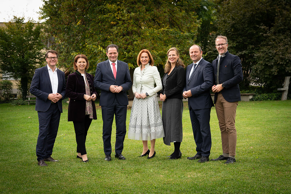 Stadtrat Jürgen Czernohorszky (Wien), LR.in Michaela Langer-Weninger (OÖ), Bundesminister Norbert Totschnig, LR.in Simone Schmiedtbauer (Steiermark), LH-Stv.in Anja Haider-Wallner (Burgenland), LH-Stv. Josef Geisler (Tirol) und LR Christian Gantner (Vorarlberg) bei der Landesagrar:referentinnenkonferenz in Graz