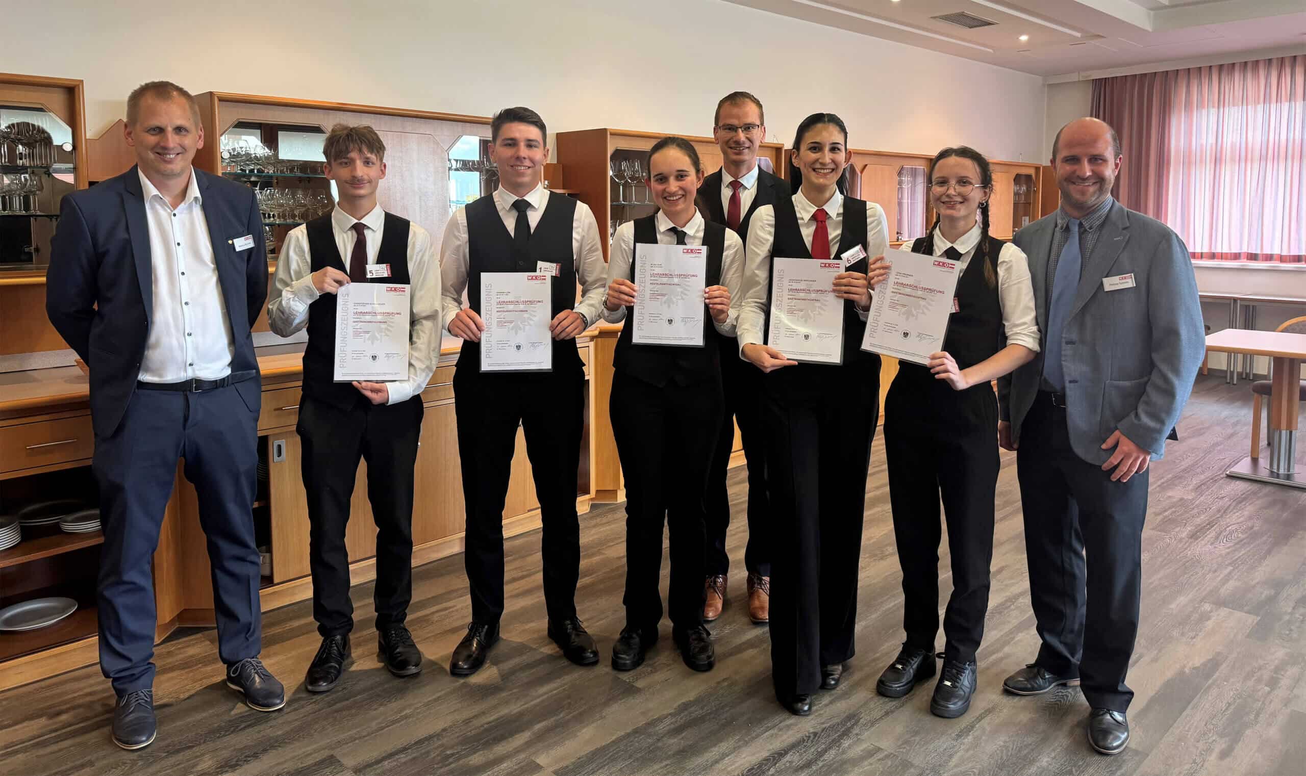 Zwölf Jugendliche im Lehrberuf Koch/Köchin sowie fünf in den Lehrberufen Restaurant- beziehungsweise Gastronomiefachmann/-frau schlossen ihre Ausbildung erfolgreich ab. Im Bild: Markus Buchner (Prüfungskommission), Christopher Schadlbauer (Gastronomiefachmann), Dominik Löbl (Restaurantfachmann), Alina Ohr (Restaurantfachfrau), Peter Halper (Prüfungskommission), Leoni Sophie Wipplinger (Gastronomiefachfrau), Lena Prunner (Gastronomiefachfrau) und Philipp Szemes (Prüfungskommission) (v. l.)