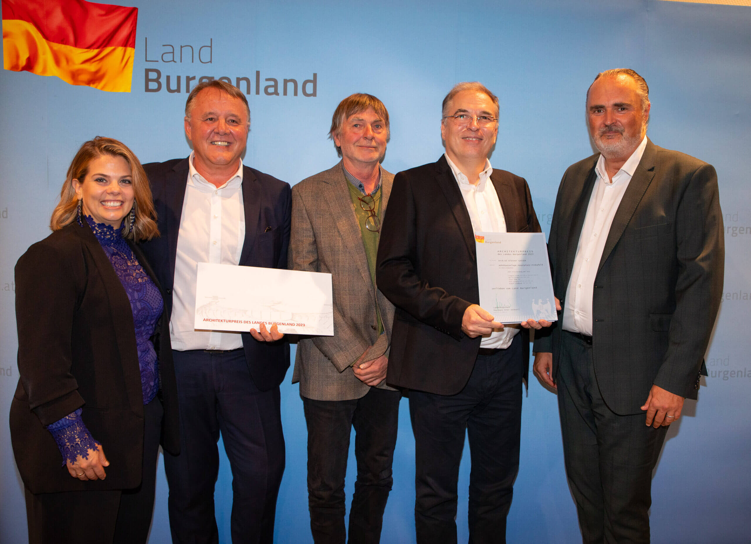 Preis für zeitgenössische Architektur an Hausdorf Architekturbüro Dietmar Gasser für die Wphnanlage in Pinkafeld (v.l.): Claudia Priber( Abteilungsvorständin Abt. 7 Kultur), Werner Gschirtz (Neue Eisenstädter), Architekt Dietmar Gasser und Alexander Langer (Geschäftsführer Neue Eisenstädter), Landeshauptmann Hans Peter Doskozil
