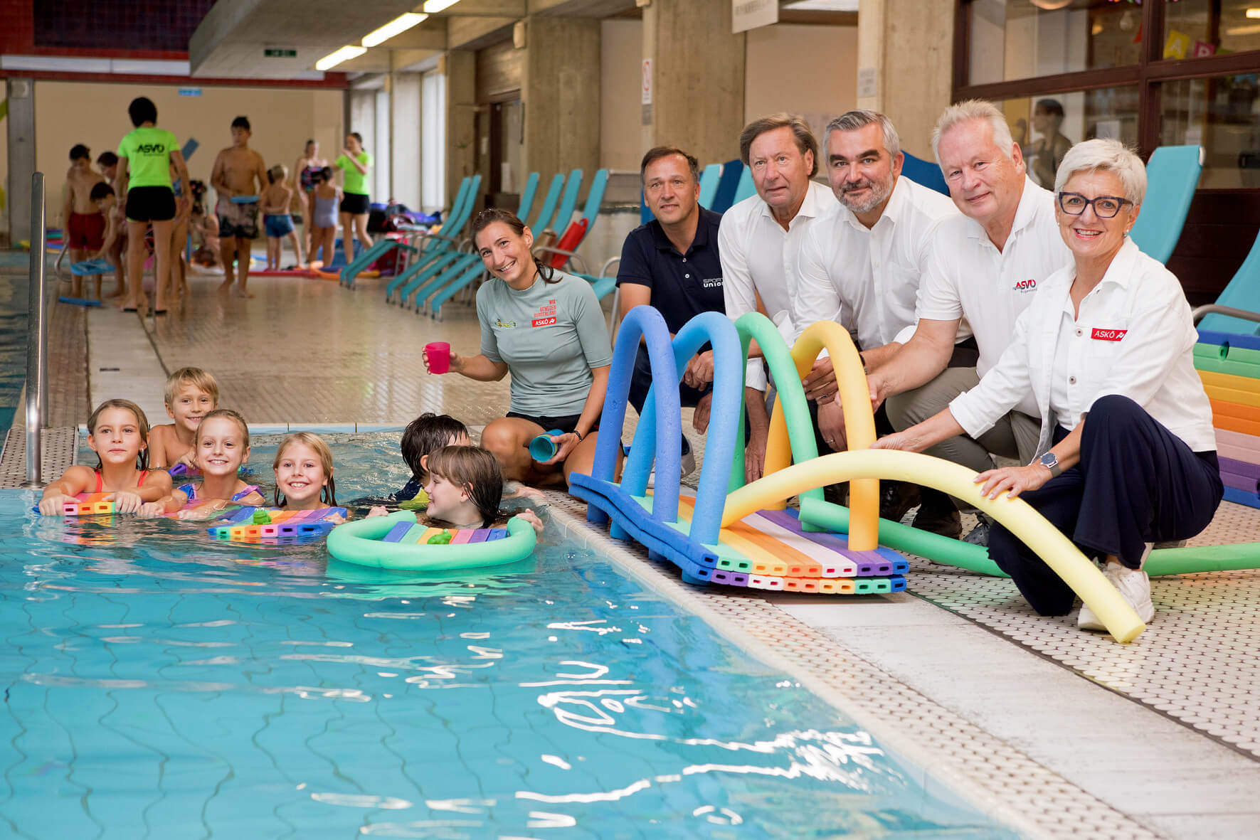 Sport-Landesrat Mag. Heinrich Dorner (3.v.r.) mit Pinkafelds Bürgermeister, 3. Landtagspräsident Mag. Kurt Maczek (4.v.r.) sowie Vertreterinnen und Vertretern der Dachverbände ASKÖ, ASVÖ und Sportunion sowie Kindern im Hallenbad Pinkafeld.