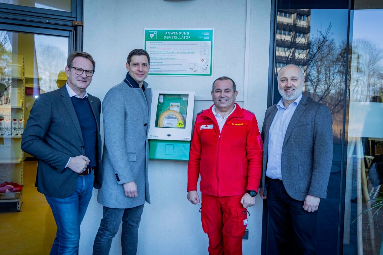 Schnelle Erste Hilfe für Besucherinnen und Besucher sowie Mitarbeiterinnen und Mitarbeiter des Hartberger Ökoparks. Foto: Bürgermeister Marcus Martschitsch, Geschäftsführer der Stadtwerke-Hartberg Christoph Ehrenhöfer, Bezirksrettungskommandant Reinhard Peinsipp und Markus Hummer (v.l.).