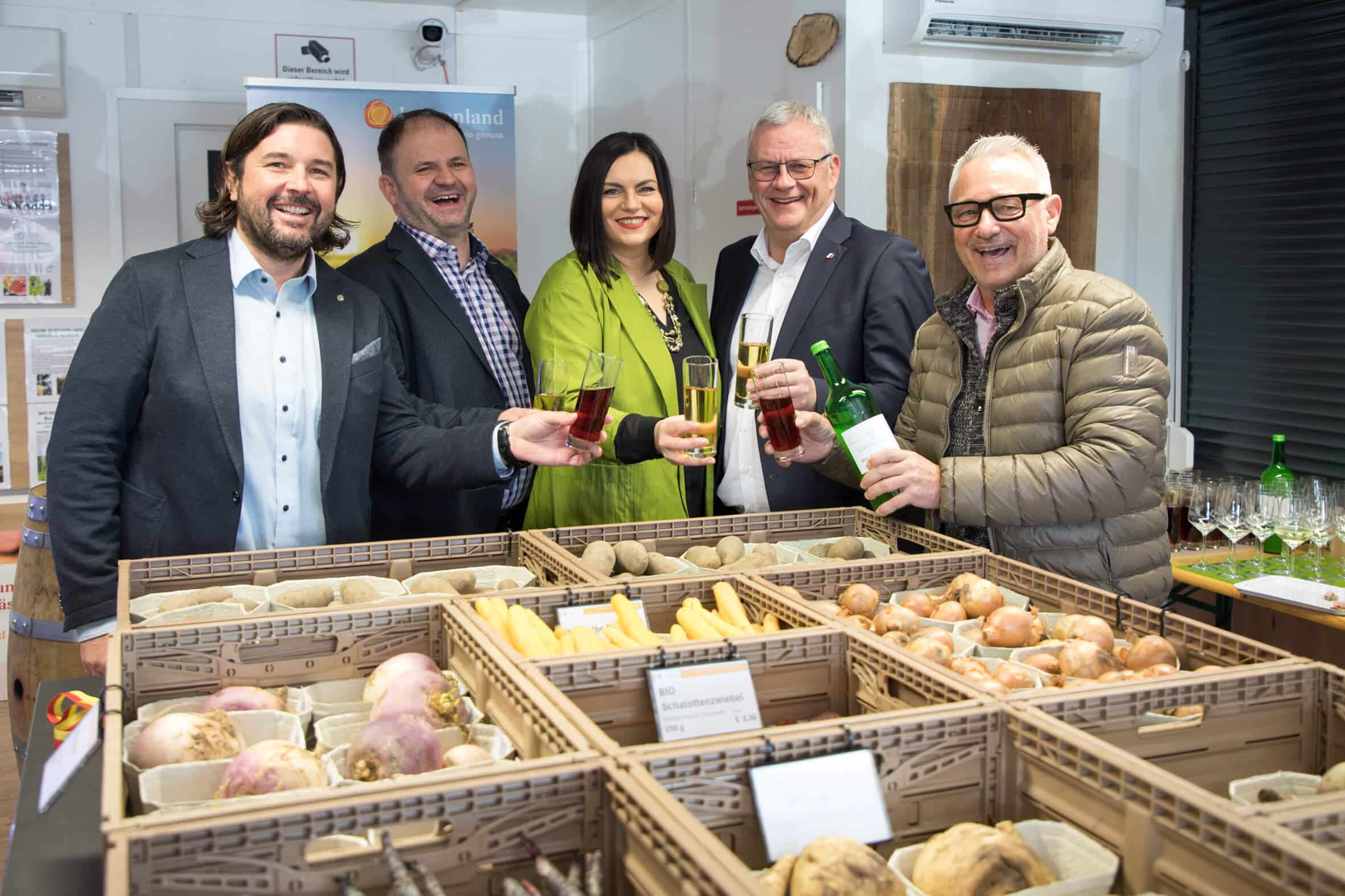 Landesabgeordneter Hans Unger, Andreas Schlögl (Obmann Biogenossenschaft Burgenland eGen), Landeshauptmann-Stellvertreterin Astrid Eisenkopf, Landesabgeordneter Thomas Steiner, Hannes Anton (Geschäftsführer Biogenossenschaft Burgenland eGen, v.l.) stoßen auf die Eröffnung des SB-Bauernladens in Eisenstadt an.