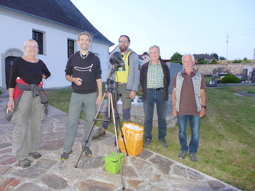 Die Naturschutzorgane Silvia Strauch, GRÜNE Klubobmann Wolfgang Spitzmüller, Alexander Gutstein von Batlife, Sepp Weinzettl und Hans Leitner bei der Fledermauszählung in Wiesfleck