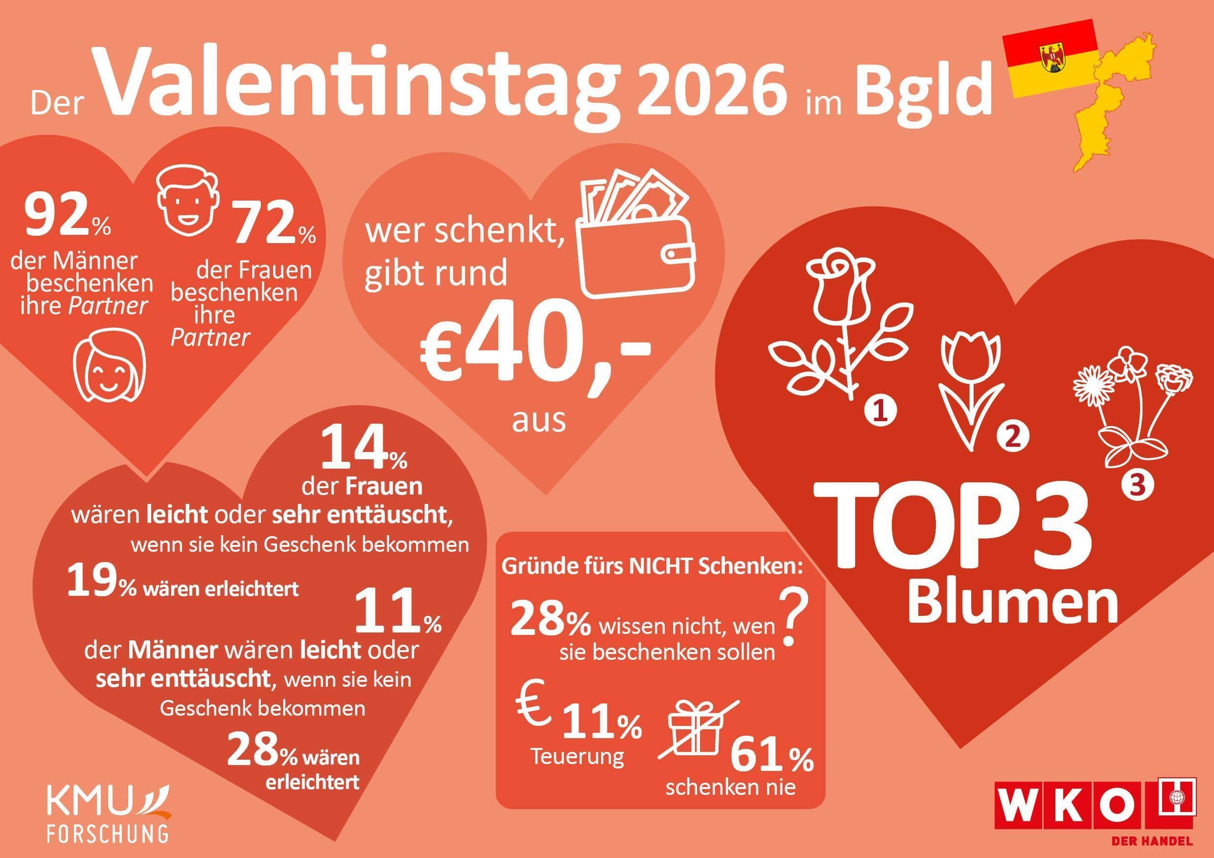 Der Valentinstag im Burgenland bleibt auch 2026 ein fixer Termin im Kalender vieler Schenkender. 66 Prozent der Burgenländerinnen und Burgenländer wollen ihre Liebsten am 14. Februar mit einem Präsent überraschen. Pro Person sind dafür durchschnittlich rund 40 Euro vorgesehen. Im Vergleich zum Vorjahr ist die Ausgabebereitschaft damit leicht gesunken. Insgesamt rechnet die Sparte Handel der Wirtschaftskammer Burgenland mit einem Umsatz von etwa sieben Millionen Euro, basierend auf Daten der KMU Forschung Austria.