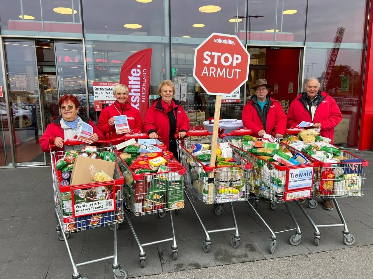 Vor zahlreichen Supermärkten im ganzen Land sammelten Mitarbeiter:innen, Ehrenamtliche und Vorstandsmitglieder haltbare Lebensmittel und Geldspenden für armutsbetroffene Familien. Insgesamt kamen 25 Einkaufswägen mit Lebensmitteln wie Reis, Mehl, Nudeln und Konserven zusammen.