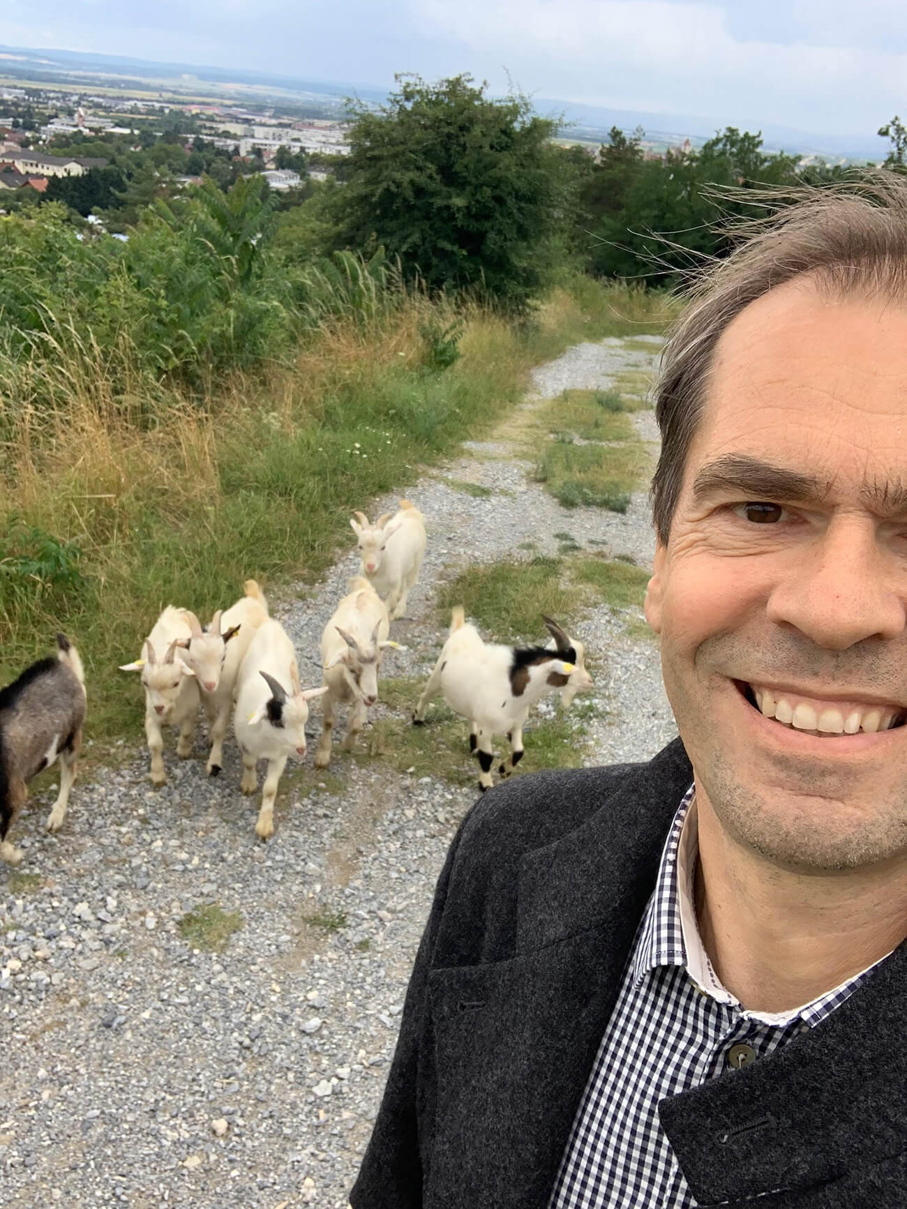Wolfgang Spitzmüller gemeinsam mit Ziegen im Leithagebirge unterwegs