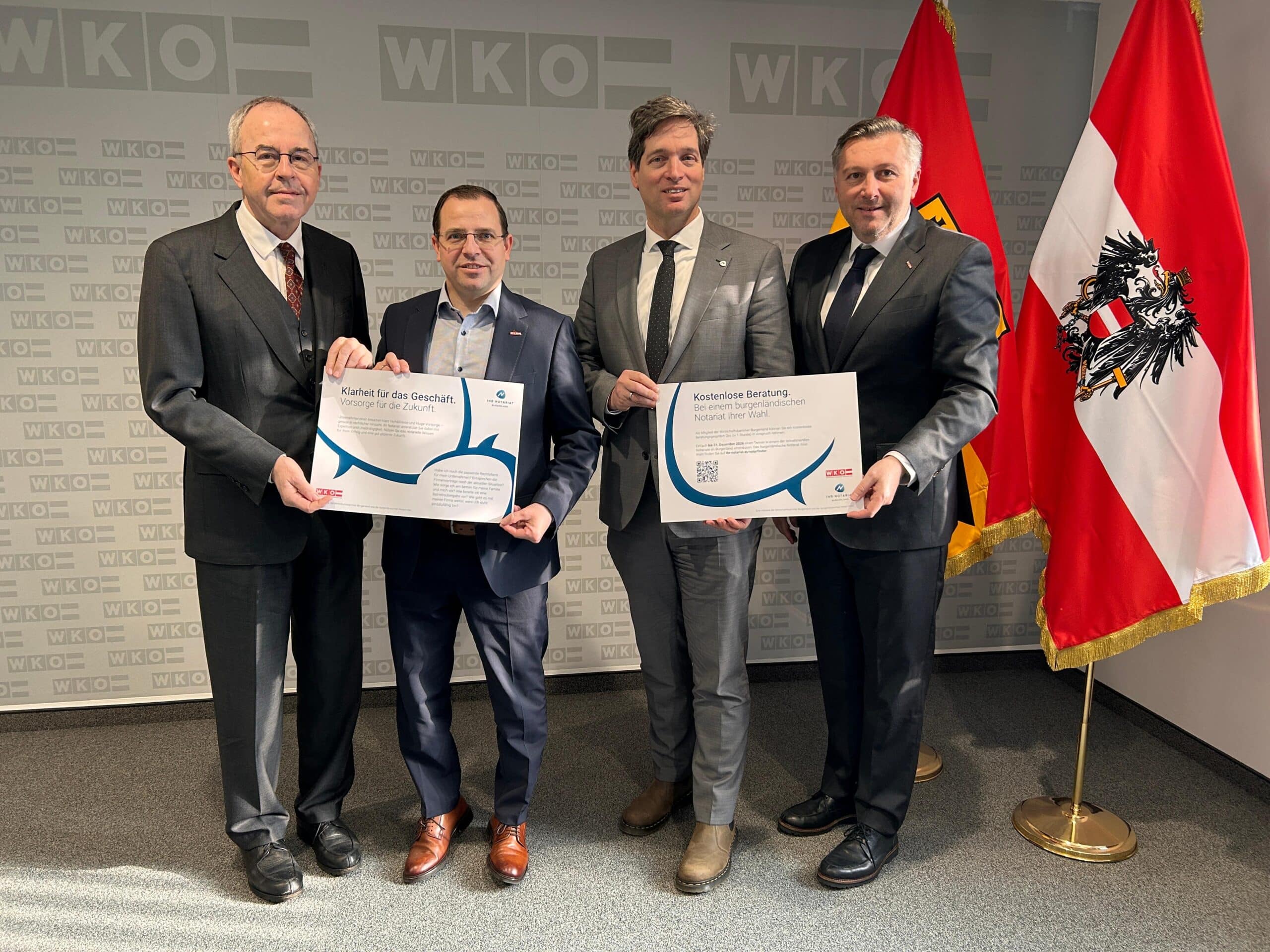 Christian Sonnweber (Geschäftsführer der Notariatskammer für Wien, Niederösterreich und Burgenland), Wirtschaftskammerpräsident Mst. Andreas Wirth, Alexander Winkler (Präsident der Notariatskammer für Wien, Niederösterreich und Burgenland) und Wirtschaftskammerdirektor Harald Schermann (v. l.)