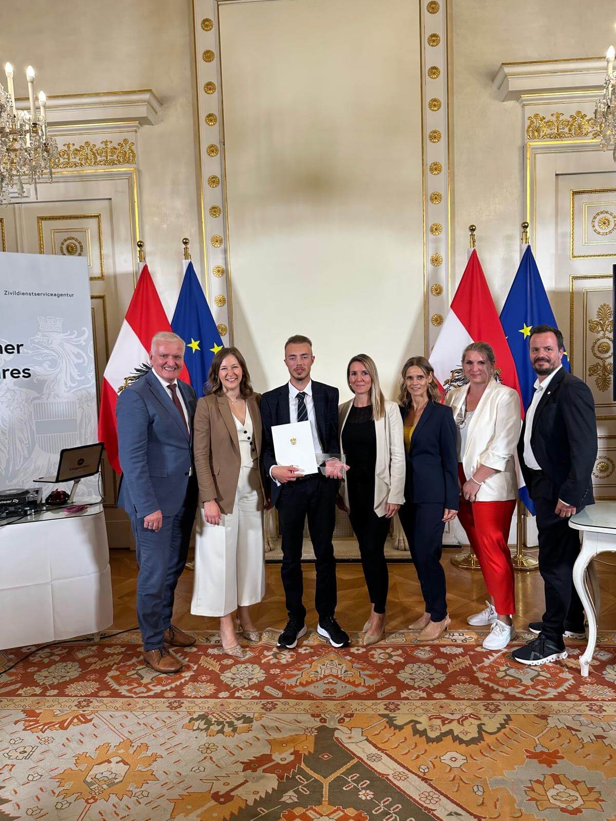 Nico Müller (3. v. li.) errang im Burgenland den Landessieg als Zivildiener des Jahres. Im Bundeskanzleramt erhielt er seine Auszeichnung von Claudia Plakolm (2. v. li.), Bundesministerin für Europa, Integration und Familie.