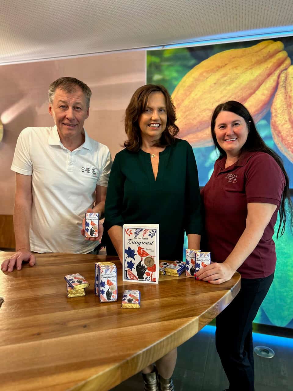 Bestseller Autorin Martina Parker und das Geschwisterpaar Sandra und Edgar Spiegel von der Pralinenmanufaktur Spiegel.