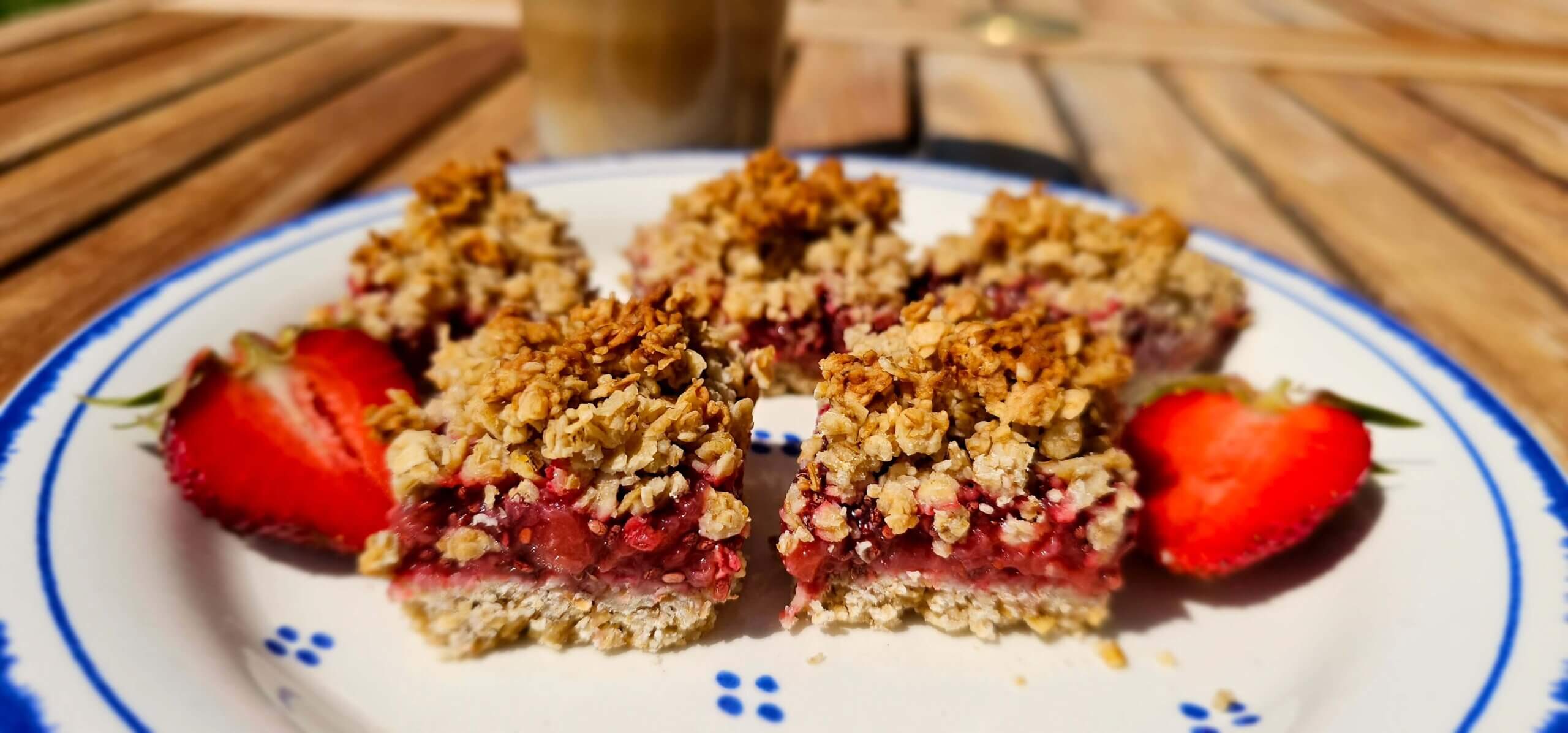• Die Erdbeermarmelade auf dem Haferflockenteig verteilen. Den restlichen Teig über die Erdbeermasse verteilen.