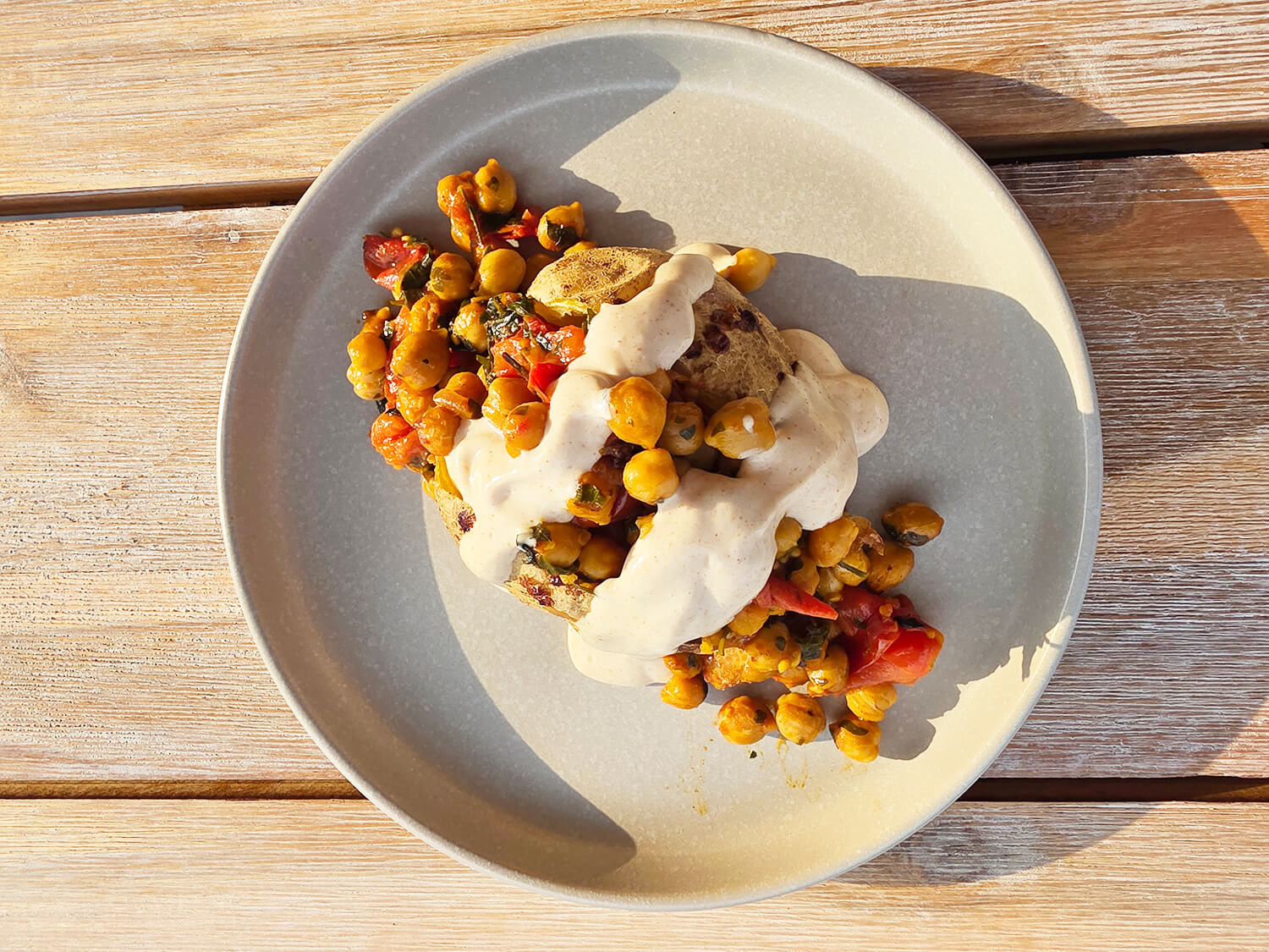 5. Die gebackenen Kartoffeln aufschneiden, das Innere leicht salzen und mit einer Gabel auflockern. Die Kichererbsen-Tomaten-Mischung darauf verteilen und großzügig mit der Harissa-Soße übergießen. ENJOI