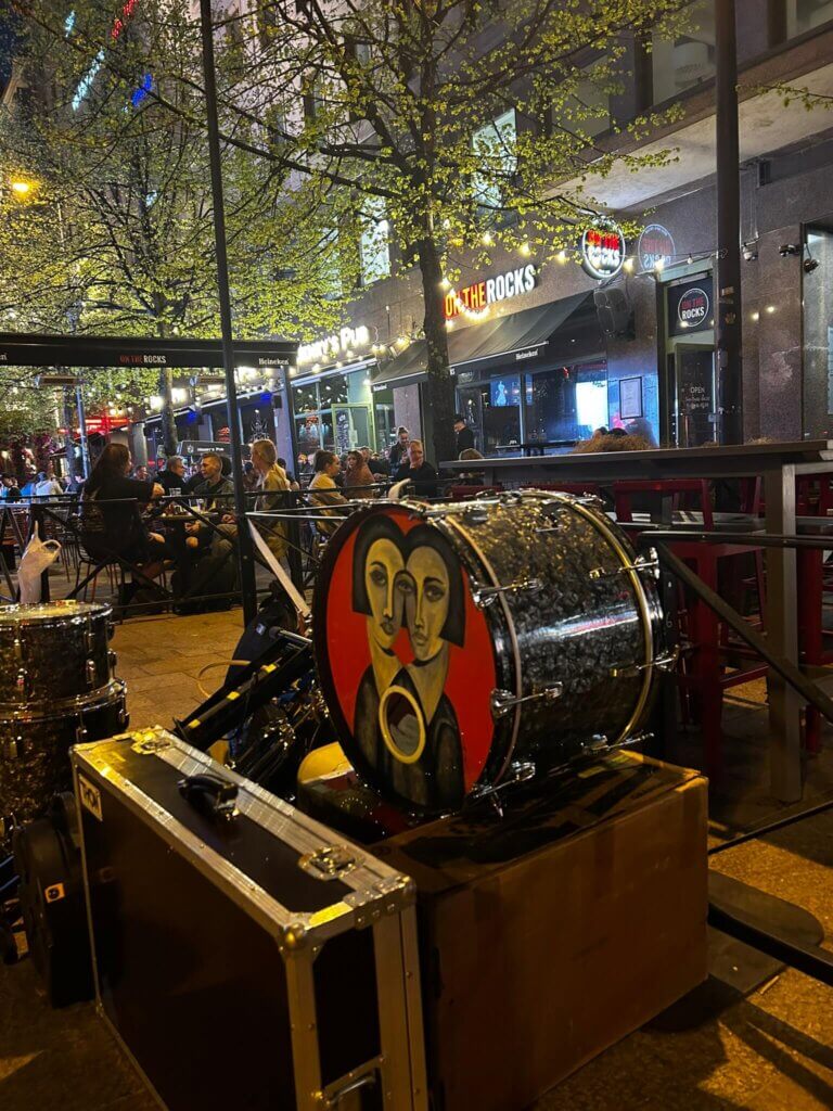 Aber nun zum eigentlichen Ziel meiner Reise: Kennengelernt habe ich meinen Schlagzeuglehrer Ana Vilkkumaa bereits auf meinem ersten Trip nach Finnland im März 2018, damals bei klirrender Kälte. Auf einer Fährenüberfahrt zwischen Helsinki und der estländischen Hauptstadt Tallinn. In diesem zollfreien Raum am Meer nutzen die Menschen die zweieinhalb Stunden Fahrtzeit auf der riesigen neunstöckigen Fähre gerne auch zum Feiern, da die Getränkepreise weitaus günstiger sind und so werden regelmäßig auch Konzerte angeboten. „Hey guys, you look like a band“, hab‘ ich Ana und seine Musikerkollegen, damals vor der Abfahrt auf ihren Instrumentenkoffern sitzend, angesprochen und seither besteht mein Kontakt und meine besondere Verbundenheit zu dieser finnischen Rockband „Shiraz Lane“.