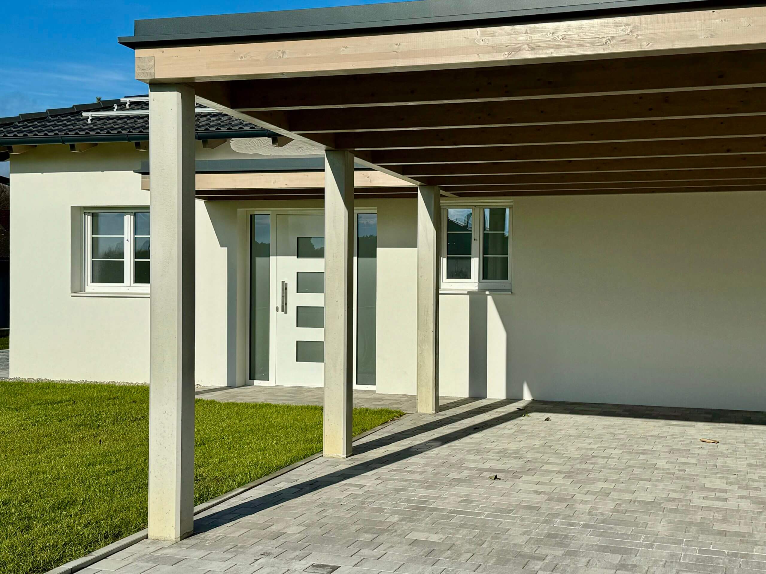 Um sich harmonisch in das Ortsbild zu integrieren, wurde bei der Planung der Häuser der ländliche Stil berücksichtigt und dieser verbindet sich geschickt mit vielen modernen Elementen. So etwa besitzt jedes Haus ein abgeflachtes Dach und auch beim Carport (für zwei Autos) wurde Beton mit Holz kombiniert.