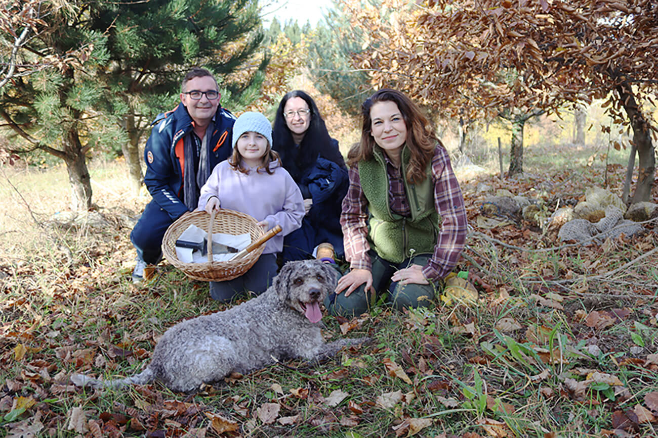 Durch die Trüffelsuche entstand eine Freundschaft. Bernhard Mittermann mit seiner Familie, Viktoria Zsifkovits und „Trüffelhund“ Aureo auf der Plantage.
